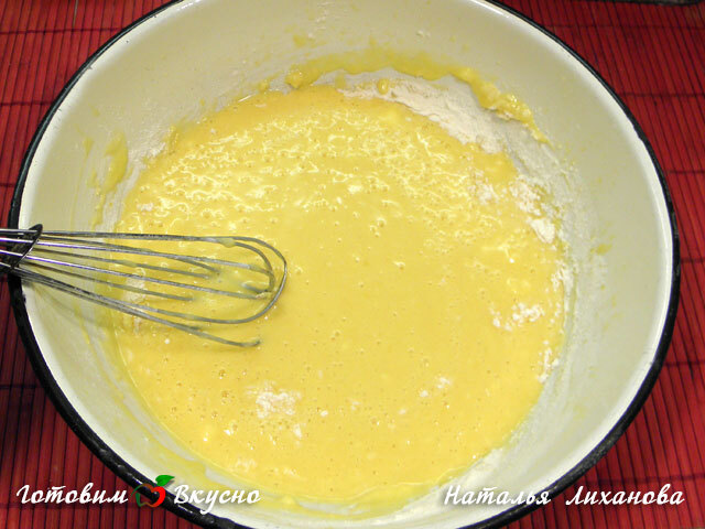 Затем добавляем просеянную муку и хорошо перемешиваем, чтобы не было комочков.