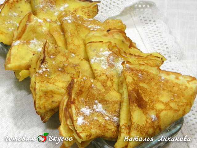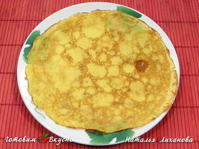Жарим тонкие блинчики с двух сторон на растопленном сливочном масле.