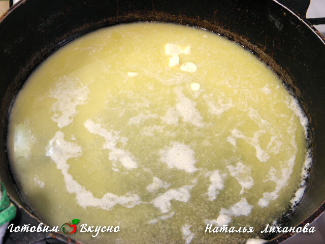 Масло держим на огне до тех пор, пока оно не станет коричневого цвета с характерным ореховым запахом.