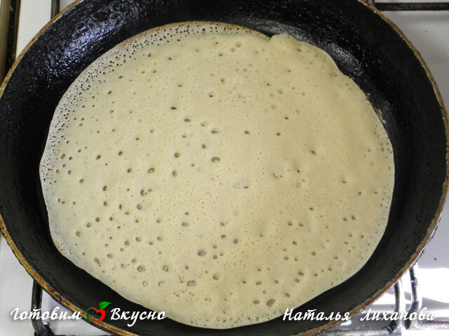 Блины жарим на хорошо разогретой сковороде, немного смазывая ее маслом. Сковороду накрываем крышкой.