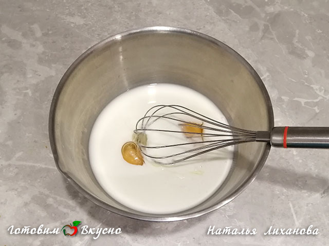 Для приготовления заварных блинчиков на кефире берем миску вливаем кефир, добавляем к нему яйца, соль и сахар. Перемешиваем венчиком до однородности.