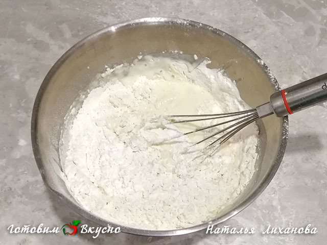 Далее в кипяток добавляем соду, перемешиваем и добавляем в тесто, снова перемешиваем до однородности, последним добавляем растительное масло, еще раз все тщательно перемешиваем до гладкой однородной массы.