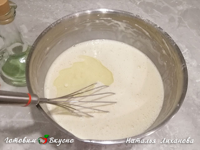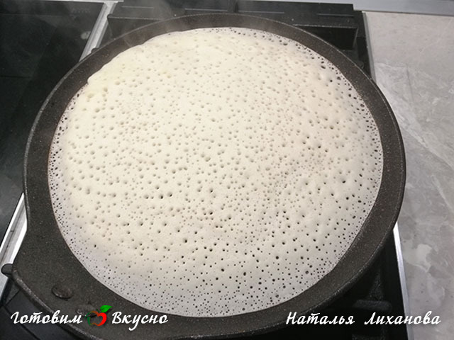 В первый раз сковороду слегка можно смазать растительным маслом, затем блины выпекаем без смазывания сковороды.