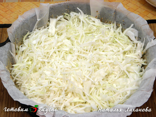 Для приготовления капустного пирога шинкуем капусту, немного ее обминаем, солить не нужно. Форму застилаем пергаментной бумагой, смазываем растительным маслом и немного присыпаем панировочными сухарями. Выкладываем сюда капусту.