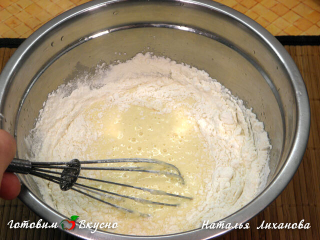 Смешиваем майонез, яйца, сахар, соль, соду и муку. Получается жидкое тесто (как на оладьи).