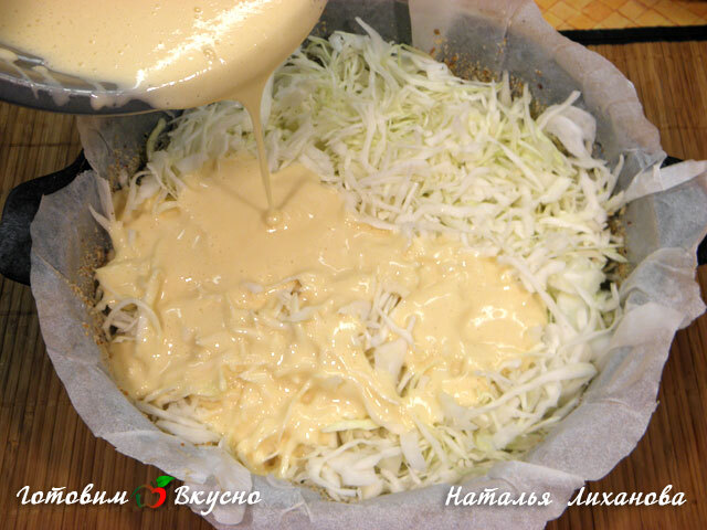 Поливаем тестом капусту. В нескольких местах протыкаем вилкой, чтобы тесто протекло. Ставим в духовку и выпекаем пирог 40 мин при температуре 180 градусов.