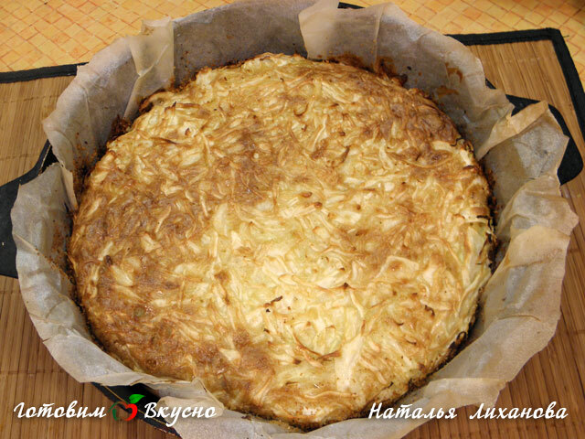 Когда пирог будет готов, вынимаем его и аккуратно убираем пергамент. Капустный пирог вкусен как в горячем, так и в холодном виде.