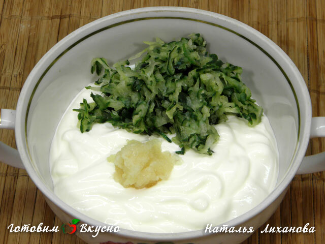Для приготовления цацики, огурцы трем на мелкой терке и отжимаем сок.