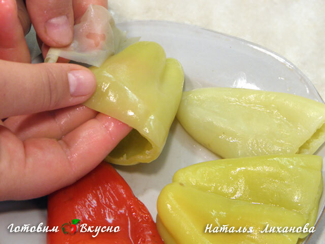 Перец сверху чуть-чуть смазываем растительным маслом и запекаем перцы в духовке или микроволновке до мягкости (до отделения верхней пленочки) минут 20-25. Также можно воспользоваться пароваркой. Даем остыть, и снимаем пленочку, она отделяется довольно легко.