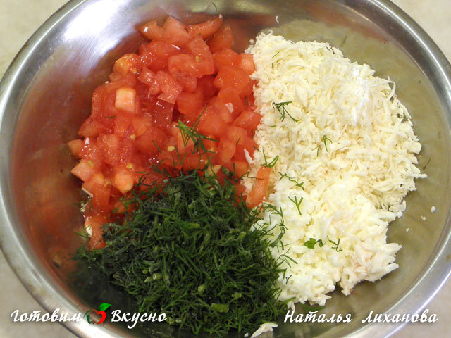 Приготовим начинку для чушка бюрек. Брынзу и белок 1-го яйца мелко крошим (или трем на терке), зелень измельчаем, помидор очищаем от кожуры и мелко крошим. Солим и перчим по вкусу. Все смешиваем и растираем вилкой.