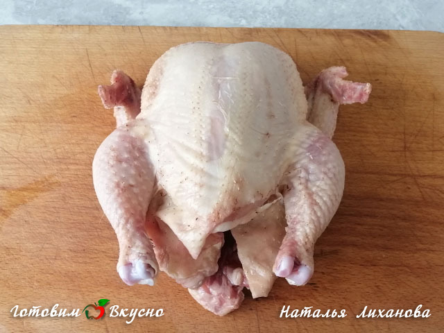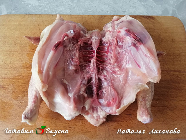 Затем разрезаем цыпленка вдоль между грудками. Убираем, если остались, легкие и сердце, промываем водой и снова хорошо просушиваем.