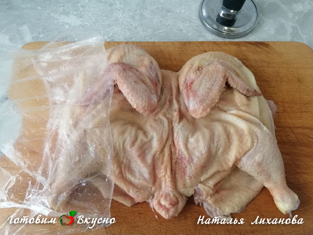 Теперь нам нужно отбить цыпленка гладкой стороной топорика, ему нужно сломать суставы (как ни печально бы это не звучало) , наша задача сделать тушку плоской и примерно одинаковой толщины, тогда цыпленок равномерно прожарится.