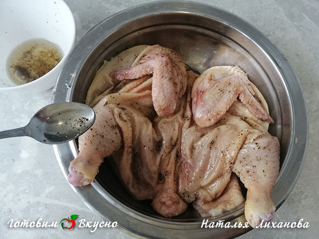 Приготовим легкий маринад. Смешиваем примерно 30 г растительного масла, чайную ложку черного перца и сок половины лимона, перемешиваем. Цыпленка кладем в миску, солим его по вкусу и поливаем маринадом со всех сторон. Оставляем мариноваться в холодильнике на 2-3 часа, а лучше на ночь.