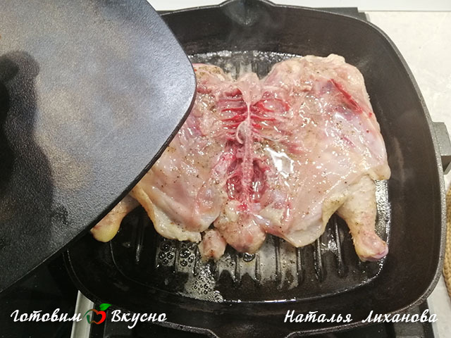 Далее берем сковороду, ставим на средний огонь, наливаем немного растительного масла и добавляем сливочного масла. Ждем пока сковорода и масло разогреются и выкладываем цыпленка шкуркой вниз, не забываем про груз, это важно!