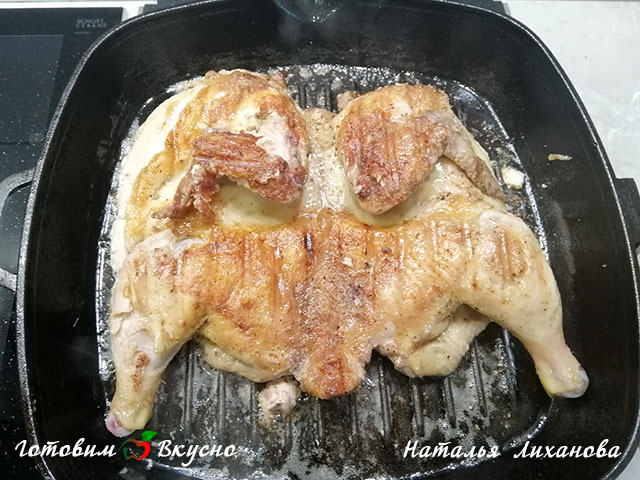Жарим его до румяного золотистого цвета на это у меня ушло 15 минут. Плиты у всех разные ориентируйтесь на цвет и огонь ставьте умеренный. Переворачиваем цыпленка на другую сторону и жарим его ровно такое же время.