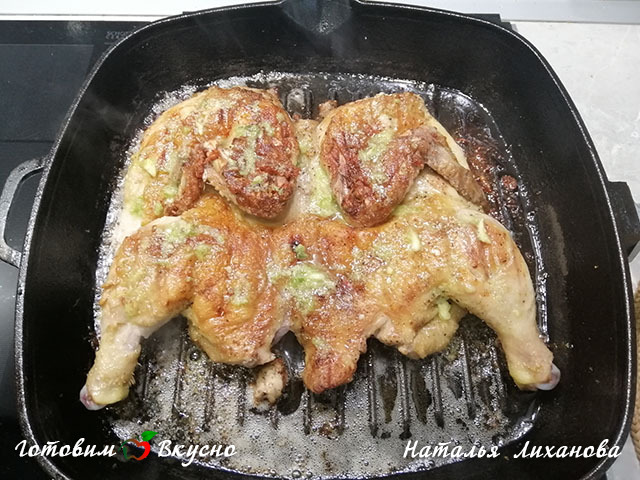 Снова переворачиваем шкуркой вниз и еще чуть подрумяним его 1-2 минуты. Берем подготовленную ароматную эмульсию и половину ее выкладываем на цыпленка, немного прогреем ее, буквально пол минуты, затем переворачиваем цыпленка, и выкладываем оставшуюся эмульсию, еще пол минуты и наш цыпленок тапака готов! Подаем цыпленка с зеленью и соусом, на ваш выбор.