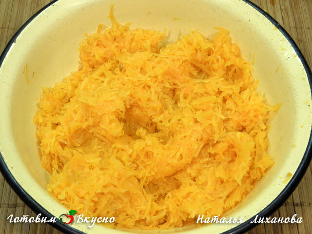 Чтобы приготовить драники из тыквы, очищенную тыкву трем на мелкой терке.