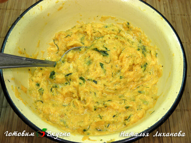 К тыкве добавляем яйцо, чеснок, муку, измельченную зелень, соль и перец по вкусу. Все перемешиваем.