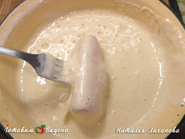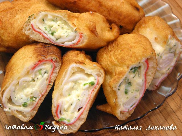 Рецепт отличной закуски к пиву и не только. Пиво в готовом блюде не чувствуется, оно придает хрустящую текстуру тесту. Вместо пива можно взять холодную минеральную воду с газом. Подаются фаршированные крабовые палочки в пивном кляре с соусом на основе сметаны.