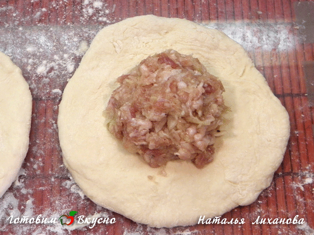 Для начинки фарш можно еще раз пропустить через мясорубку вместе с луком (можно воспользоваться блендером), солим и перчим по вкусу и все хорошенько перемешиваем. Из теста формируем лепешки и посредине выкладываем начинку. Объем начинки должен быть равен объему теста.