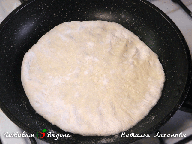 Теперь руками аккуратно формируем каждый узелок опять в лепешку. А потом при помощи скалки раскатываем лепешку в тонкий блин (3-5 мм, чем тоньше, тем лучше). Размер блина должен быть равен размеру сковороды.