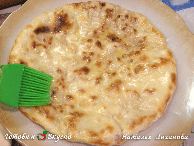 Обжариваем хычины на хорошо разогретой сковороде (сухой!) на среднем огне. Они могут вздуться в процессе обжаривания, просто проколите их. Каждый хычин после обжаривания смазываем обильно сливочным маслом. Складываем их стопочкой желательно в подходящую кастрюльку и накрываем крышкой. Они обмякнут и станут очень нежными.