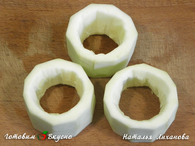 Чтобы приготовить кабачки фаршированные гречкой и куриным фаршем, кабачки моем, чистим (если это нужно) и нарезаем на такие бочоночки примерно по 5 см. С помощью ложки убираем серединку.