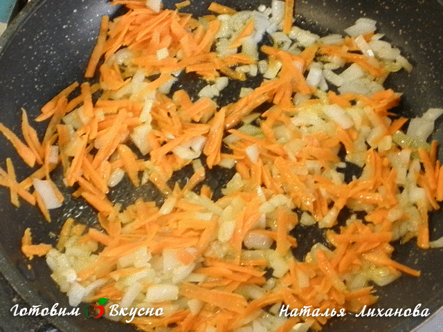 Морковь трем на терке, лук мелко рубим, все обжариваем в небольшом количестве подсолнечного масла до мягкости.
