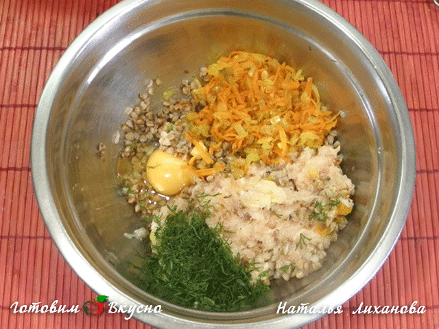 Смешиваем в миске все компоненты для фарша: гречку, куриный фарш, яйцо, обжаренные лук и морковь. Также добавляем немного укропа, соль и перец по вкусу. Перемешиваем.