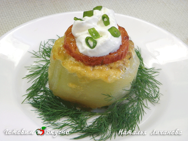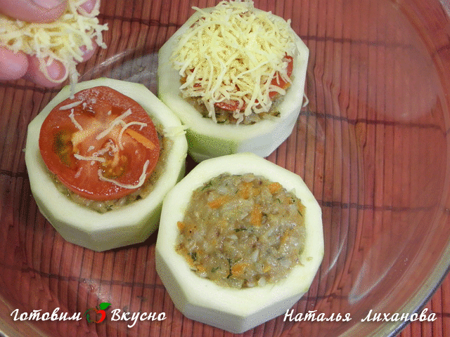 Подготовленные кабачки выкладываем в удобную емкость для запекания, немного смазанную маслом. Наполняем кабачки фаршем, сверху кладем кружочек помидора и посыпаем натертым сыром. Форму закрываем крышкой (или фольгой) и ставим в духовку, нагретую до 180 градусов минут на 40.