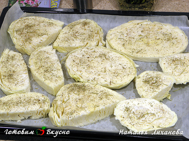 Чтобы приготовить капусту запеченную в духовке, нарезаем ее (капусту) большими кусками толщиной примерно 2 см. Аккуратно складываем, чтобы куски не развалились.