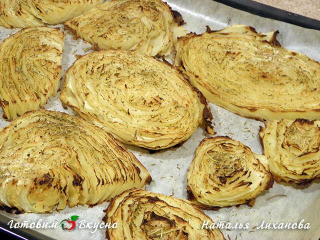 Немного соли, оливкового масла и бальзамического соуса. Наша запеченная капуста в духовке готова, полезно и вкусно!