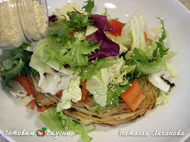 На блюдо выкладываем капусту, сверху листья салата с овощами, добавляем кунжут.