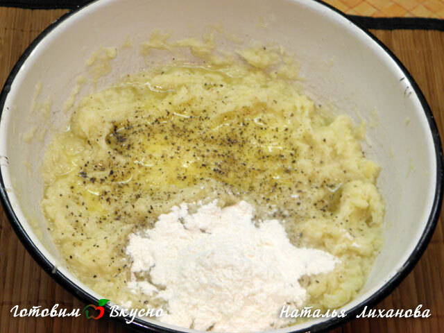 Массу периодически перемешиваем. Благодаря луку картофель не потемнеет.