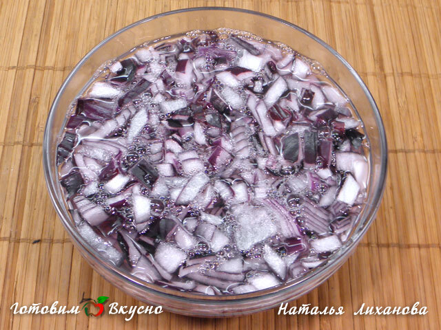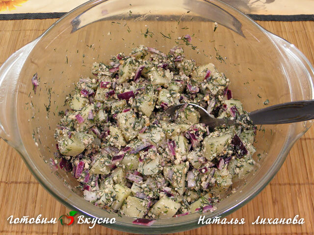 Лук и измельченную массу перекладываем в глубокую емкость, добавляем яблочный уксус и перемешиваем. Сюда же добавляем очищенный и нарезанный кубиками картофель. Солим, перчим, заправляем оливковым маслом и перемешиваем.