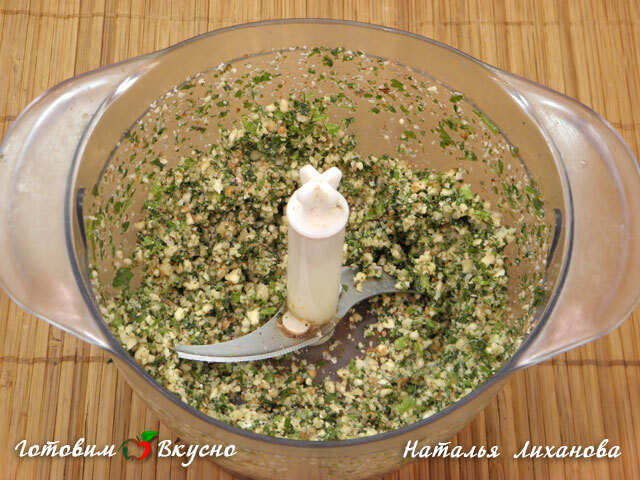 Измельчаем в блендере зелень, грецкие орехи и чеснок.