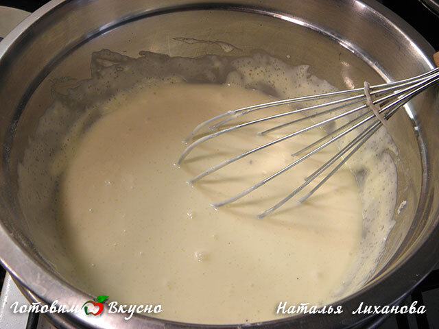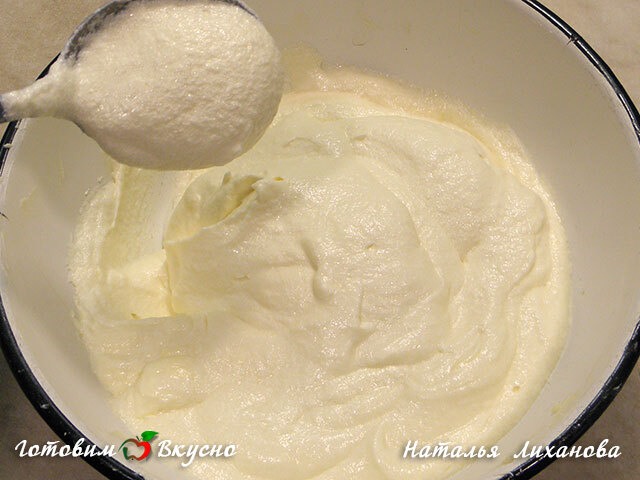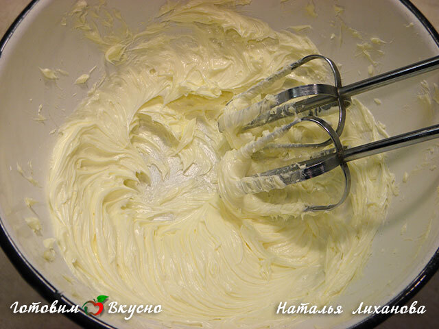 Масло взбиваем до пышности и по ложке добавляем остывшую смесь, каждый раз взбивая.