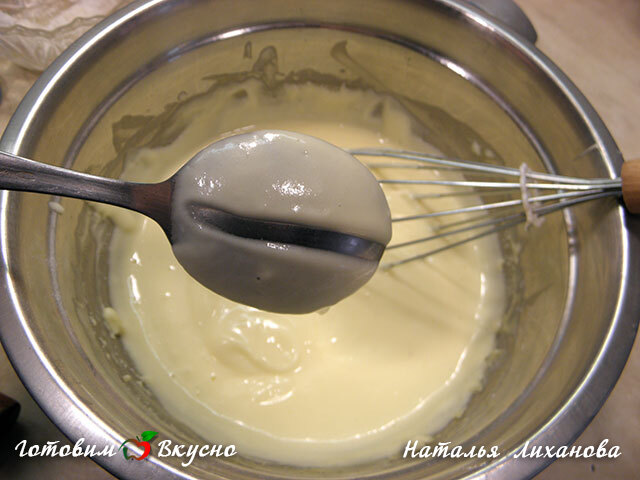 Если на ложке с кремом пальцем мы проведем дорожку и она не растекается и не исчезает - это значит смесь готова. Отставляем ее полностью остужаться.