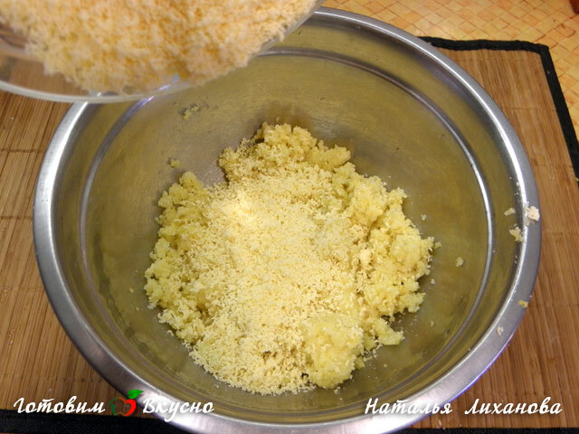 В миску с кашей добавляем яйца, тертый твердый сыр, соль и перец по вкусу.