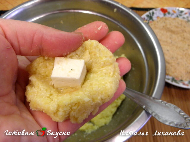 Плавленый сыр режем кубиками – это будет начинка. Кукурузную массу берем небольшими порциями, расплющиваем каждую, кладем в середину кусочек плавленого сыра и формируем котлету-биточек.