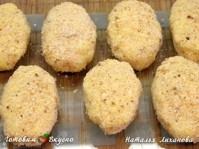 Теперь каждый биточек панируем в сухарях и жарим на топленом масле до зарумянивания.