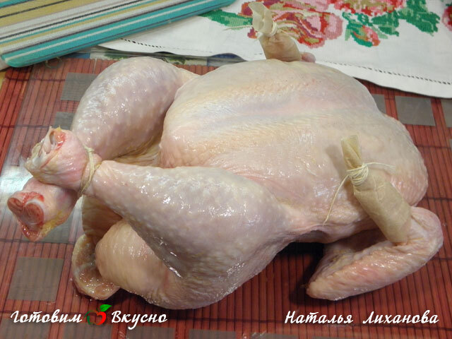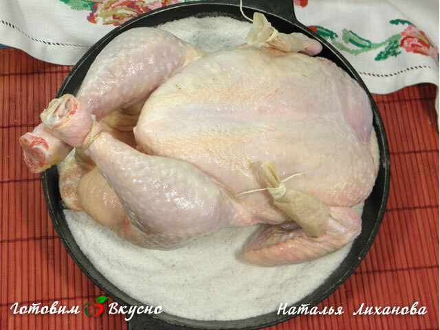 Чтобы приготовить курицу на соли, курицу моем, обязательно обсушиваем салфетками или полотенцем. Хорошо просушиваем курицу, чтобы впоследствии соль не прилипла к коже. Связываем ножки, кончики крылышек можно обернуть бумагой или фольгой, чтобы не пригорели.
