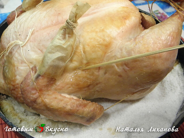 Ставим курицу в разогретую до 180 градусов духовку на 1 час 20 мин. Смысл этого рецепта в том, что в духовке создается так называемая «соляная сауна». Соль забирает из кожи влагу, она становится сухой и хрустящей, похожей на пергамент и не дает влаге испариться из мяса. Мясо остается сочным, а излишки влаги и сок скапливаются в животе у курицы. По истечению указанного времени достаем курицу и проверяем ее на готовность. Прокалываем курицу зубочисткой, если сок прозрачный – она готова.
