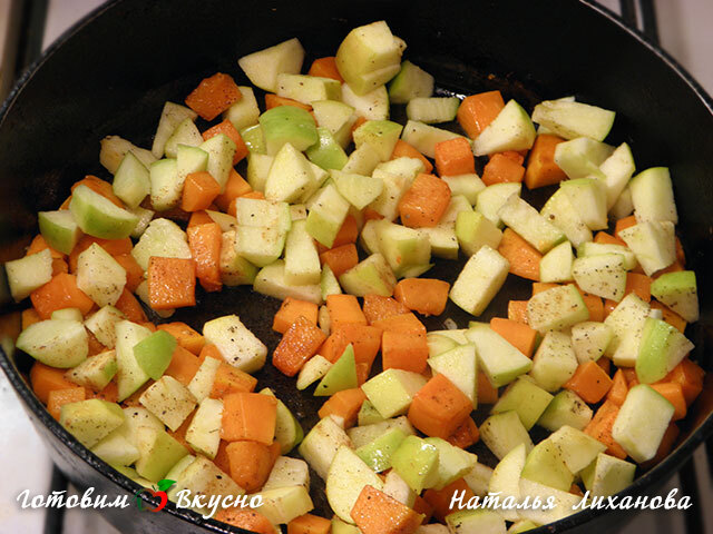 На другой сковороде обжариваем в масле тыкву, нарезанную кубиками. Когда тыква станет почти мягкой, добавляем яблоки также нарезанные кубиками. Добавляем перец, корицу, соль и сухое белое вино. Перемешиваем и еще немного обжариваем пока не выпарится вино.