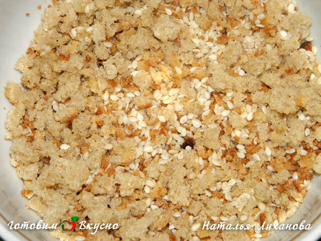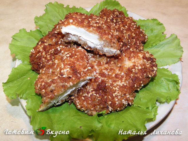 Каждый кусочек филе обмакиваем сначала в муке, потом в яичной смеси и затем в панировочных сухарях с кунжутом. Жарим в большом количестве масла до образования румяной корочки. Готовое филе сначала выкладываем на бумажную салфетку, чтобы стек лишний жир. Подаем