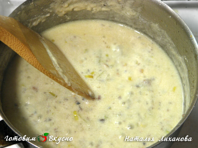 Добавляем сливки и, помешивая, провариваем соус несколько минут до загустения. Снимаем с огня, добавляем немного перца, соли.