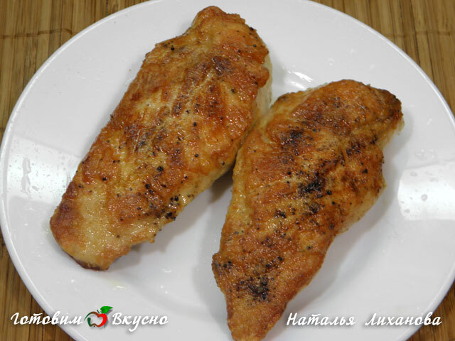 Обжаренное куриное филе подаем вместе с соусом и салатом.