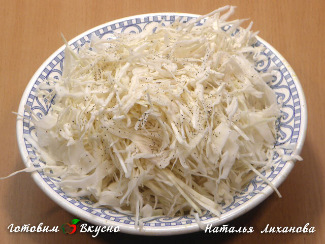 Для приготовления лаваша с куриным мясом и овощами, мелко шинкуем капусту, солим, немного отжимаем и добавляем перец.