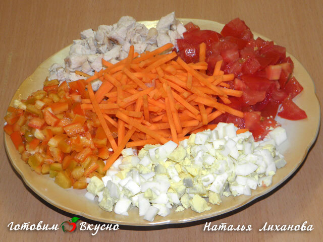 Яйца, сладкий перец, помидоры и курицу нарезаем мелкими кубиками, а морковь трем на терке (как для салата по-корейски). Все смешиваем и добавляем майонез, начинка готова.