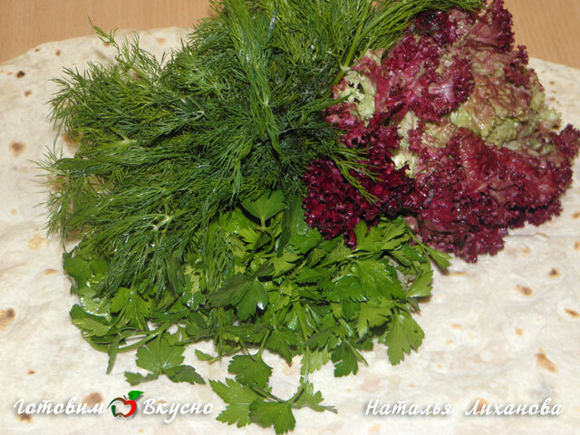 Петрушку и укроп мелко рубим, а листья салата рвем руками.